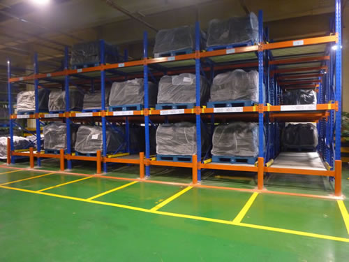 在货架的组与组之间没有作业通道,从而增加了60%的空间利用率,提高了仓储的容积率;托盘操作遵循先进先出的原则;自动储存回转;储存和拣选两个动作的分开大大提高输出量,由于是自重力使货物滑动,而且没有操作通道,所以减少了运输路线和叉车的数量。