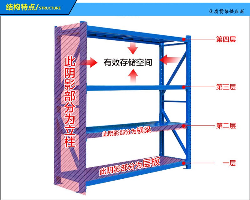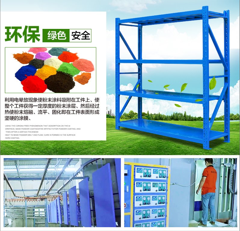 3、层板有木板和钢板可供选择,立柱高度设有每50mm调节孔距,可根据货物高低调节层间使用。