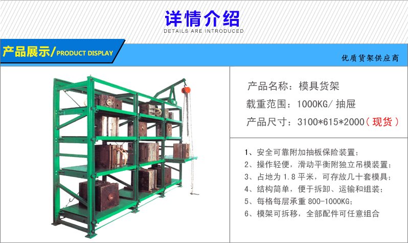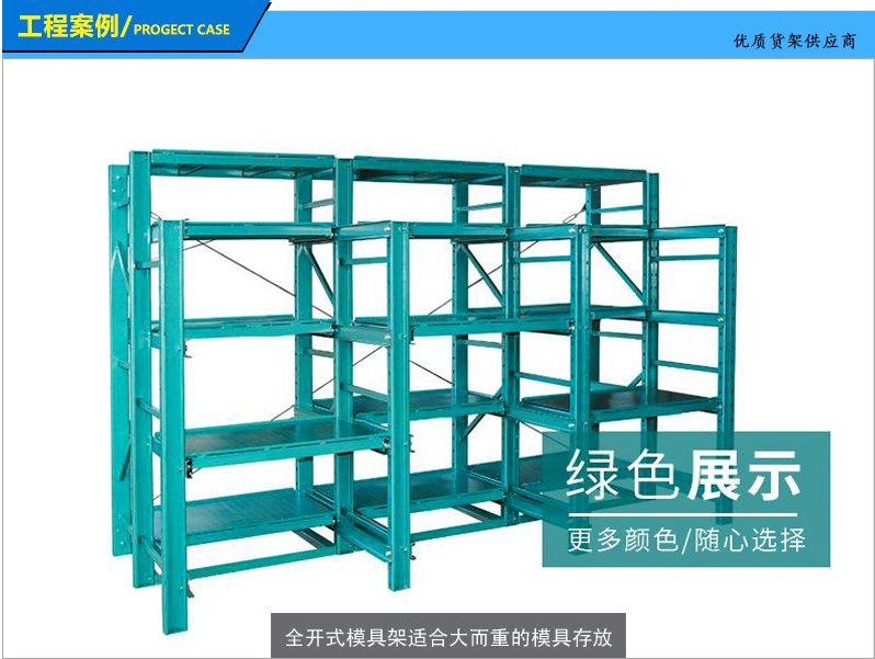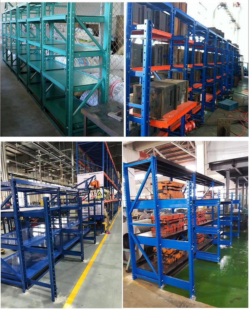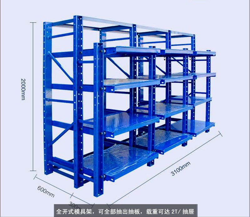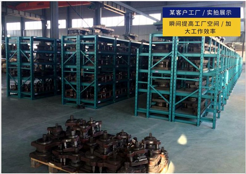 模具货架适合于存放模具等机械加工块的存放。占地少、承重大、分类详细、存取方便。抽屉式滑道,可以80%抽出,操作简易,安全,是现代化工厂的维修及加工车间的工位器具。